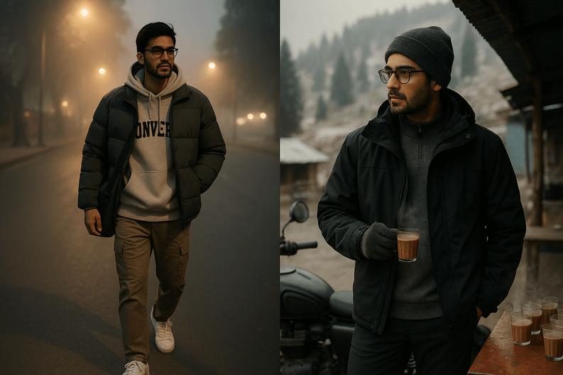 Indian winters are perfect for casual treks, bike rides, bonfire nights, or even rooftop card parties. Your winter wear should let you move freely – nothing worse than looking good but feeling like you’re trapped in bubble wrap.